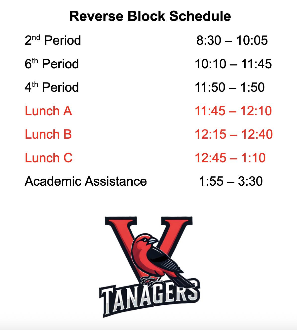 IMPORTANT! Bell Schedule - Thursday, Apr. 9, 2026 Each spring VHS hosts a Thursday track meet that requires that we invert our schedule to accommodate the number of staff it takes to make the track...